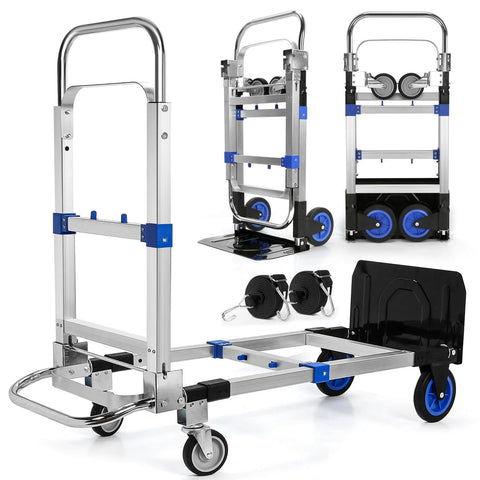Upgraded 3 in 1 Aluminum Folding Hand Truck, 600 lbs Convertible Heavy Duty Dolly Cart, Collapsible Hand Trucks with 4 Rubber Wheels and Retractable Handle for Home, Warehouse, Supermarket (Blue)