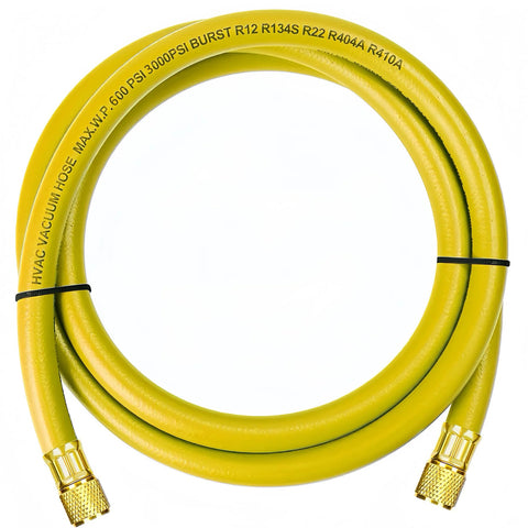 This 72-inch HVAC vacuum hose is designed for fast evacuation and refrigerant charging in HVAC systems, delivering high flow with low resistance. It uses standard 3/8" flare fittings, and the bright yellow color codes it for vacuum/charge ports, reducing misconnection risk.