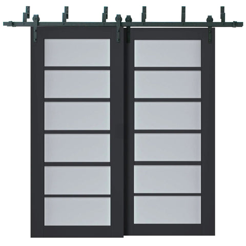 Veregio 7602 Interior Barn Bypass Sliding Doors With Frosted Glass And Solid Wood In Black Modern Style 84 By 96 Inches Includes Hardware Rails Hangers Floor Guides Stops Anti Jump Pins And Screws For Quick Install