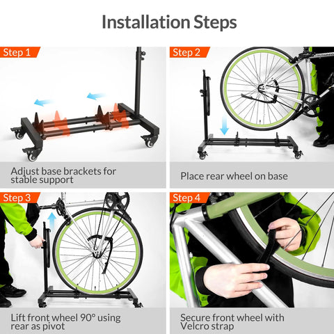 ✅ 360° lockable wheels for smooth movement and secure parking✅ Fits bikes with 24 to 29 inch wheels (610-736 mm) and tire width up to 4 inches (101.6 mm)