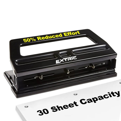 This heavy-duty 3-hole punch is built to punch through up to 30 sheets at once. It features a removable chip tray for mess-free operation and a precise paper guide to ensure perfect alignment for three-ring binders, making it ideal for office desks, classrooms, and home offices.